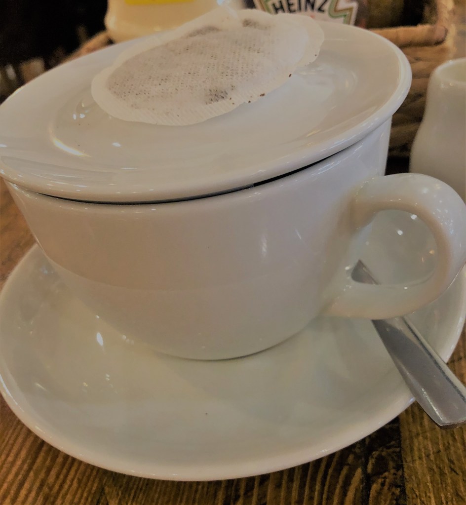 I chose the full english breakfast and was pleasantly surprised that they allowed me to switch a few items (have I said before that I am fussy?!). I ordered a pot of tea which arrived in a large cup with the saucer and tea bag on top, allowing you to place your own tea bag – that’s a nice touch.