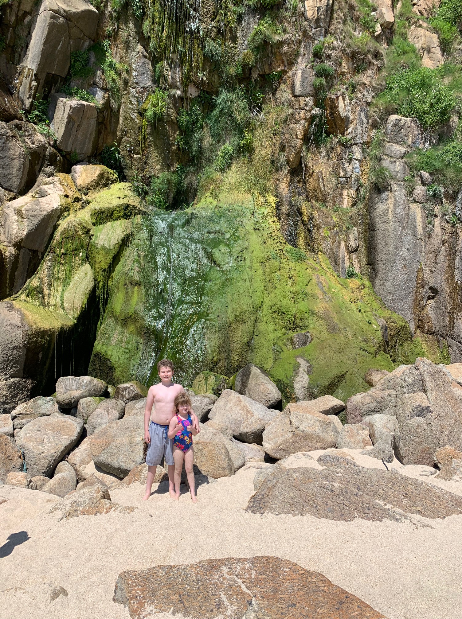 When the water (at Porthcurno) is at low tide you are able to walk around through the rocks to the left to another “secret beach”, Pedn Vounder which is pretty quiet as the only way to get to it is by the low tide. Then if you continue walking round the left you can walk over to Nanjizal Beach (be aware it is a naturist beach). The secret beach also has a few caves and tiny waterfalls down the rocks and some rock pools.