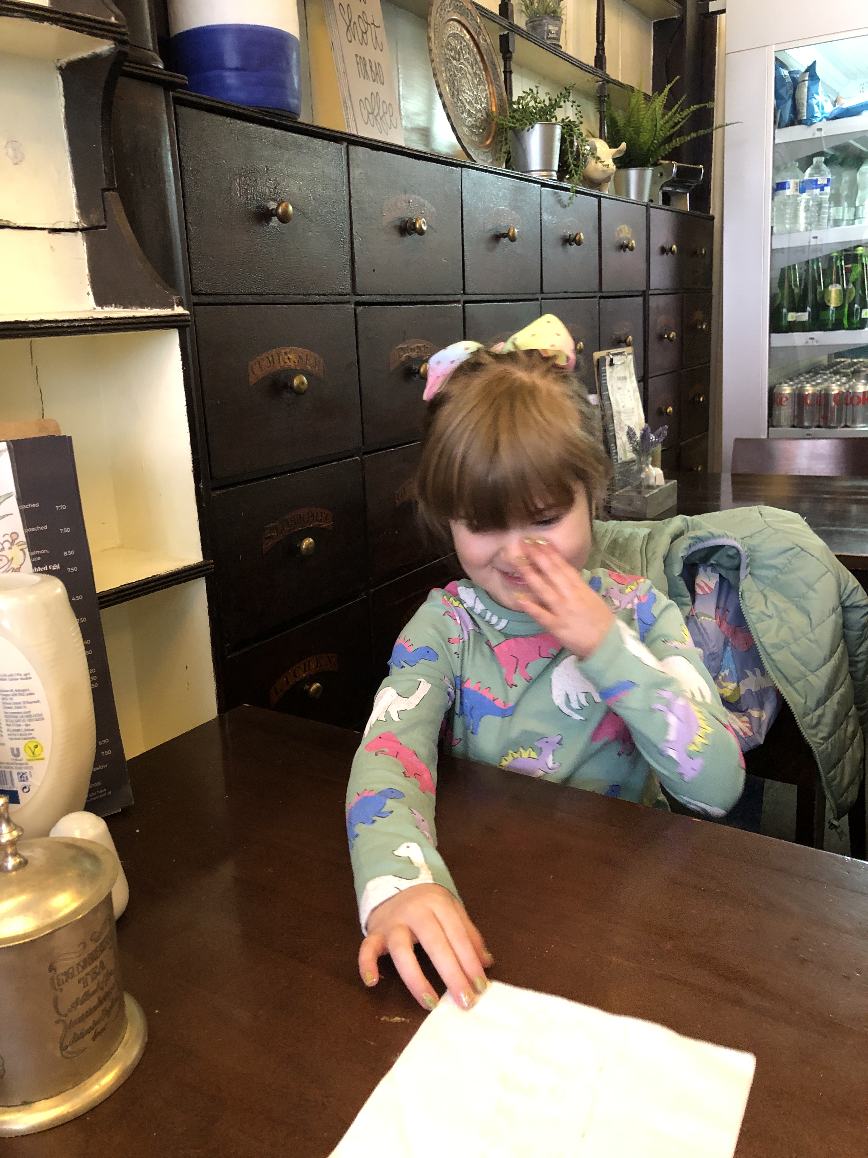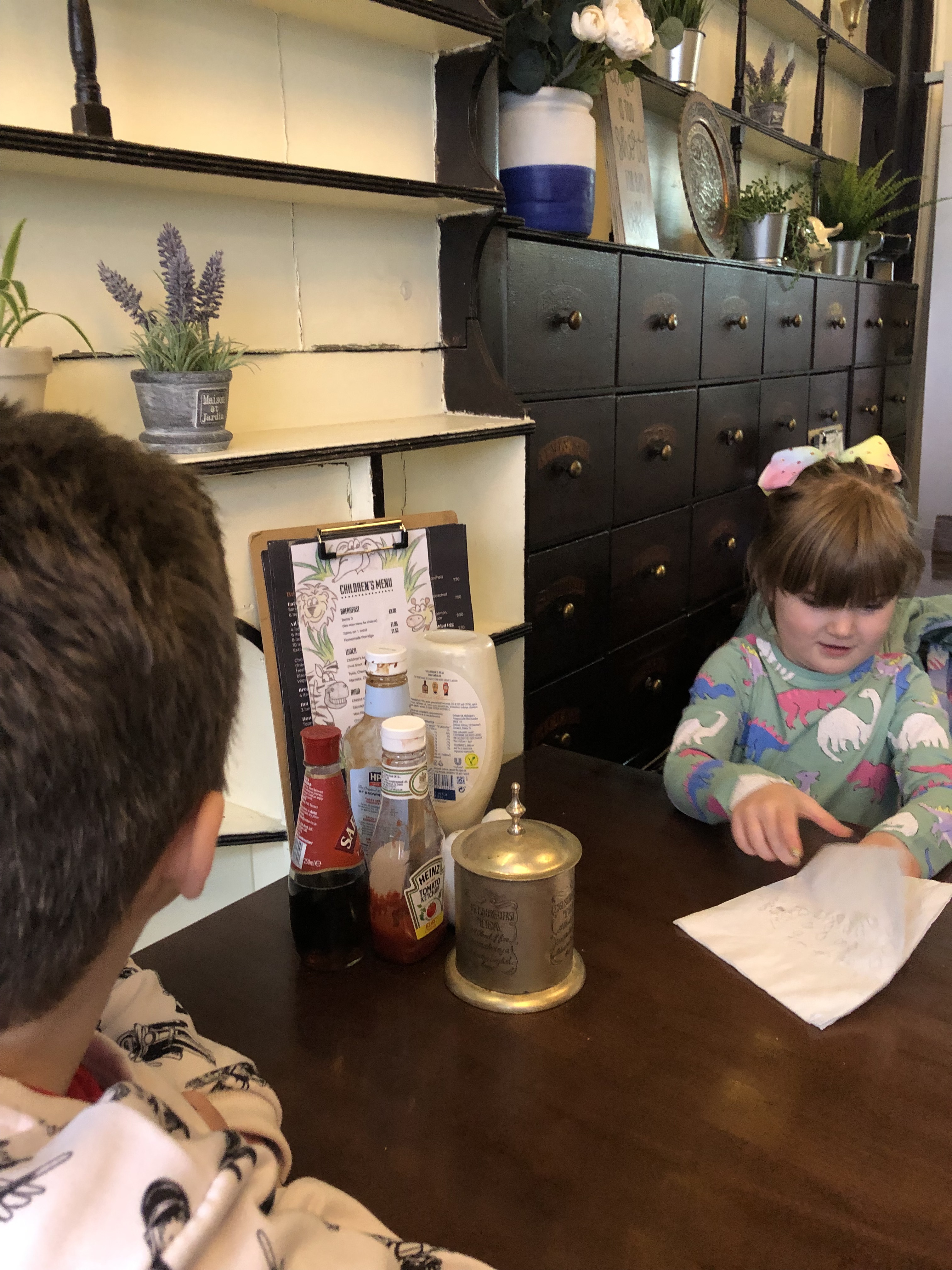 How to describe the breakfast? The food tasted like diner-style, tasty, basic but delicious with a low price but, they have the benefit of being in a great location on Stony Stratford high street, and it does not look like a diner; in fact it looks and feels pretty special inside as it used to be a chemist and it looks like it dates back at least 100 years. It has beautiful original apothecary drawers that hold herbs and medicines; retaining most of its features/shelving makes it very warm and appealing. And for an extra bonus, we found a load of hand-written messages on napkins inside the drawers (yes my little one was being nosey). She found pictures and wishes and notes, it was so lovely.